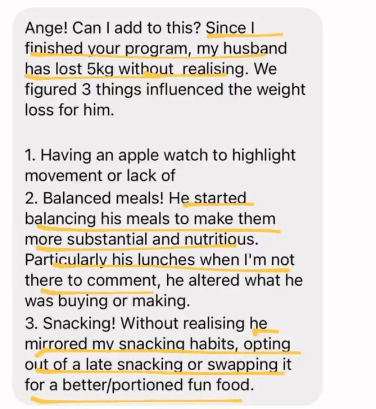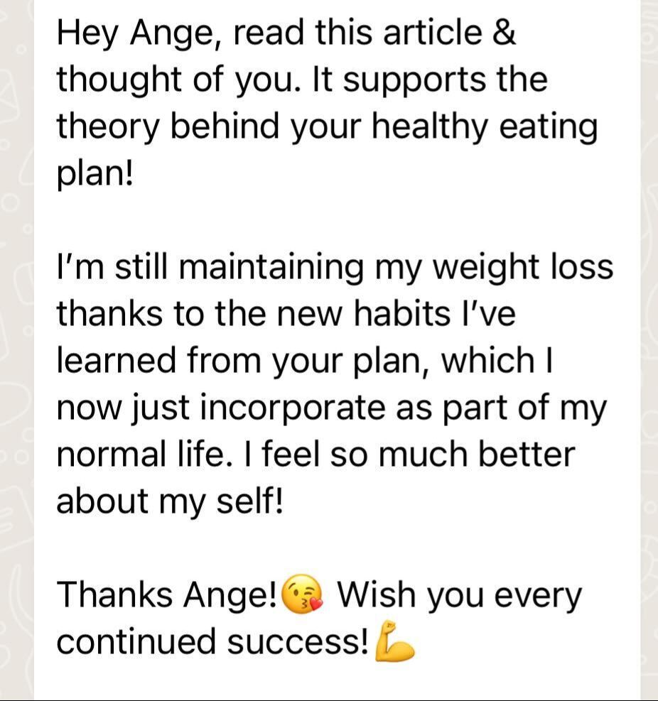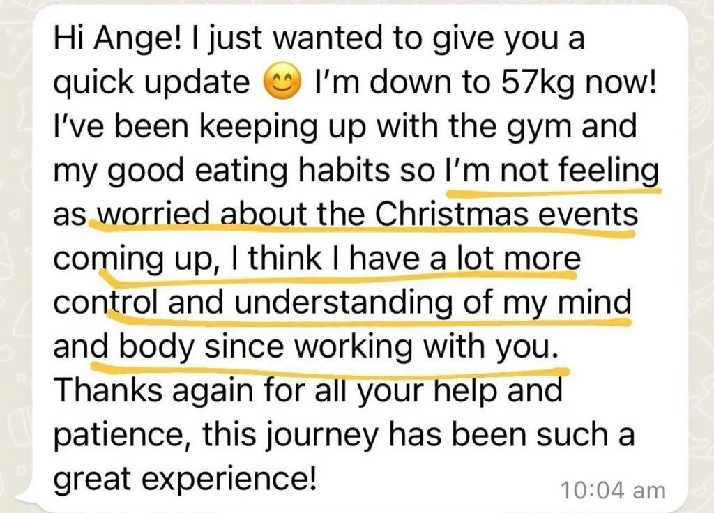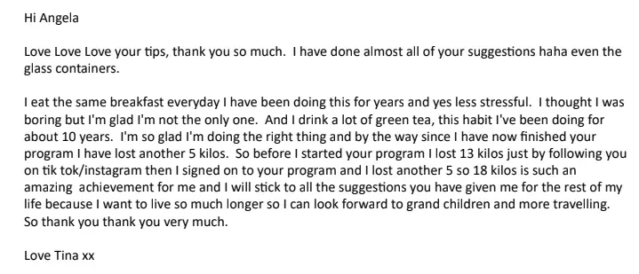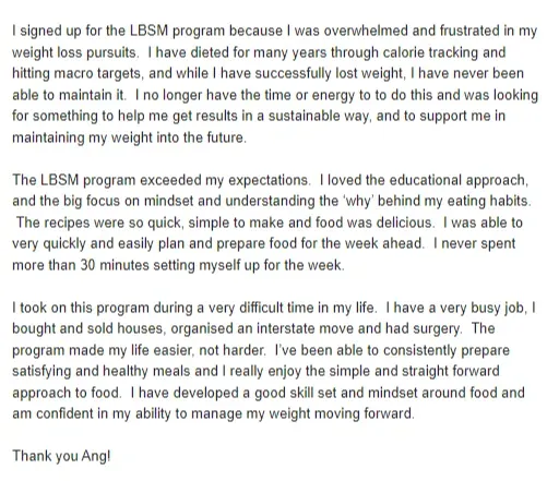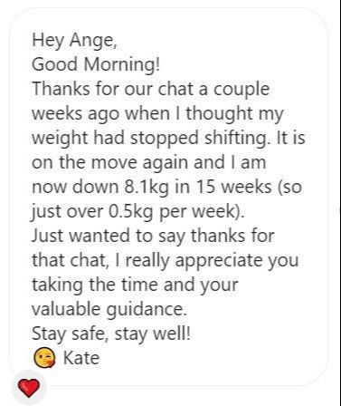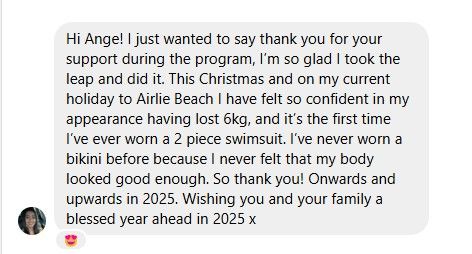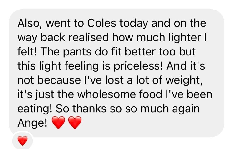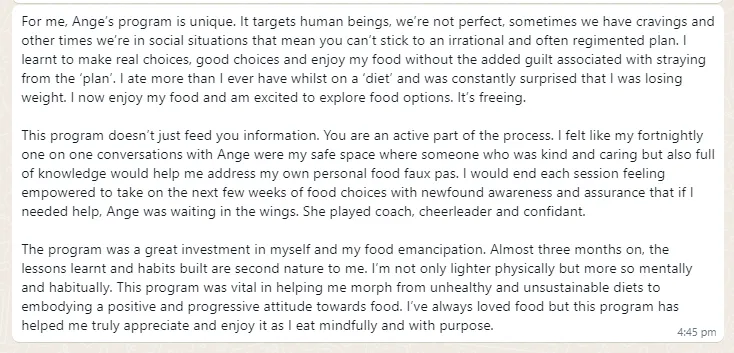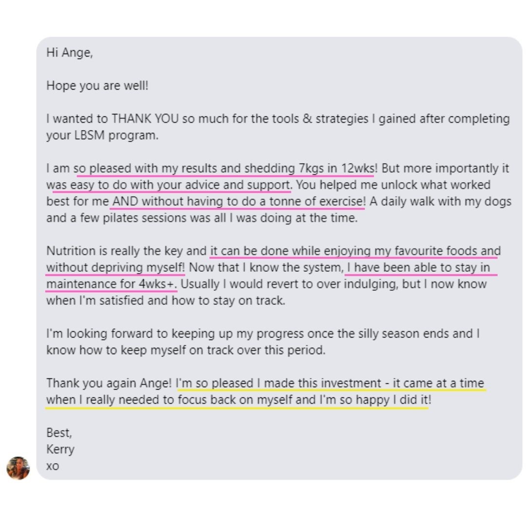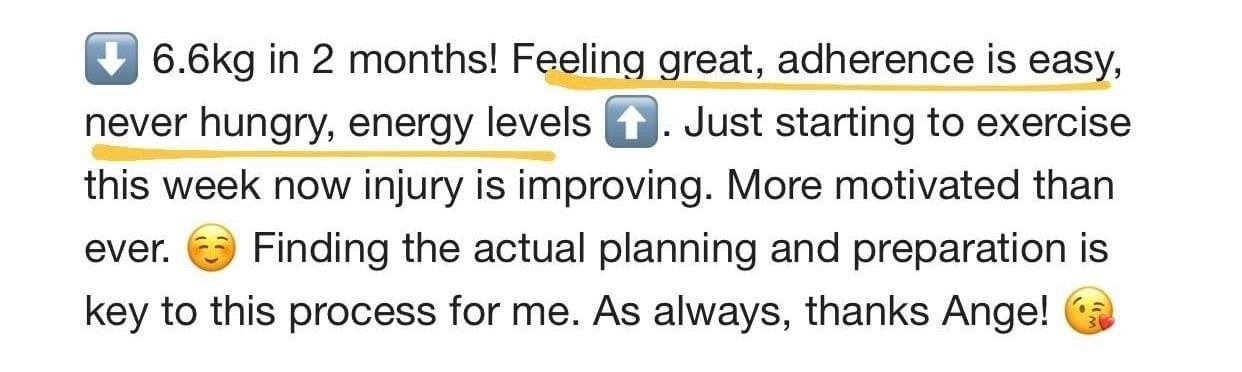 “I recently just finished my program with Ange, which has absolutely changed my life for the better. Prior meeting Ange, I’ve done almost every single diet (…) then I discovered Ange and thought if this is something that is eating in a way that I should be consistently, then this is worthwhile giving a try. I found working with her amazing. I found it hard to believe that was I was eating was going to result in any type of weight loss, but it did… every week.” - Kristy