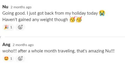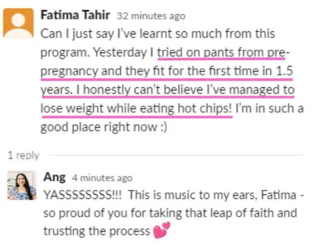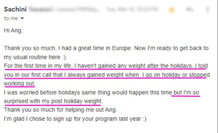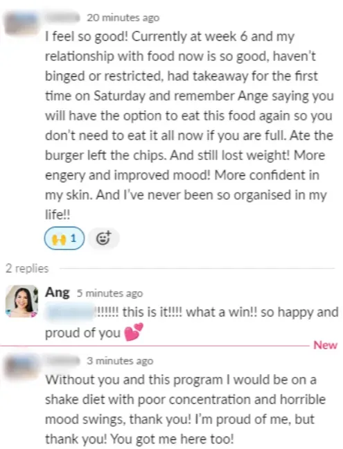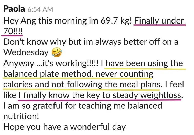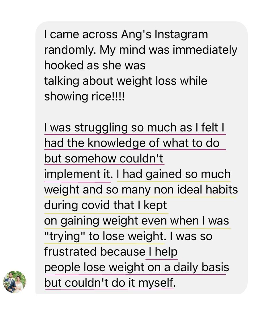 "Prior to Ang, I've tried pretty much everything to lose weight. With her, I have slimmed some centimeters and lost a couple of kilos. I've been able to maintain weight, get my energy up there, and eat better for my health. I've learned about healthy habits and emotional eating. I've learned about what my triggers were and how to tune into my body." - Fiona