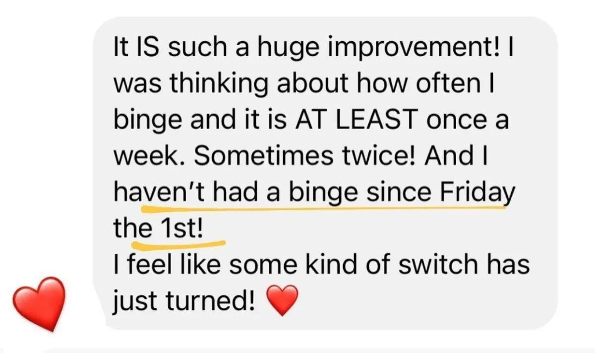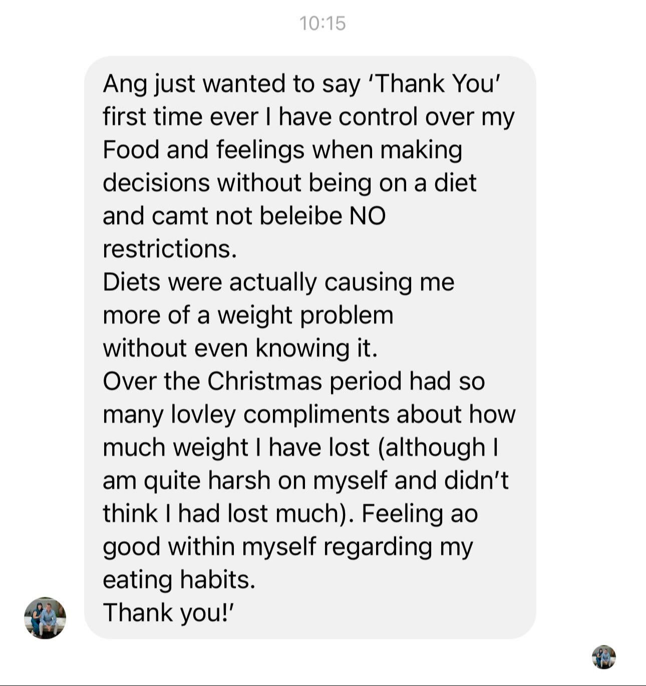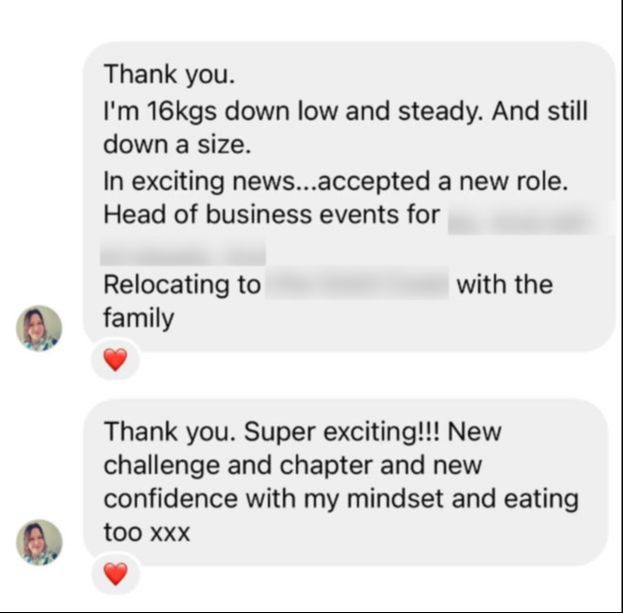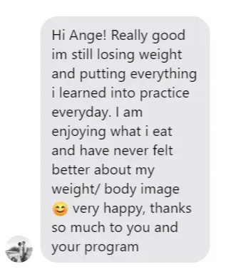 "I gained 25kgs through emotional eating. I was desperate to lose weight and went from exercising 5 days a week, 2 hrs each day with NO RESULTS... to losing weight by eating all foods, never feeling hungry, and just walking, using Ange's strategies. People are commenting on my weight loss. My clothes fit better; I feel great, I threw away the scales" - Fatma