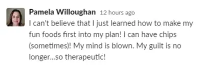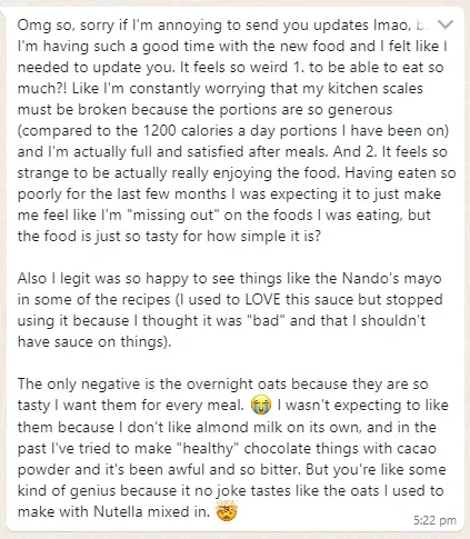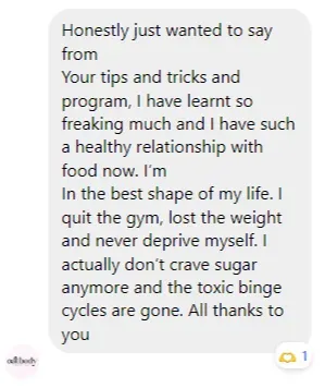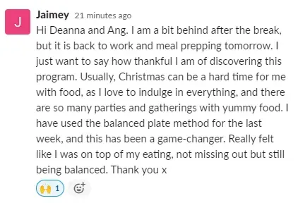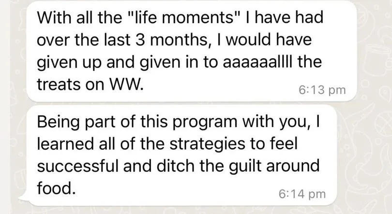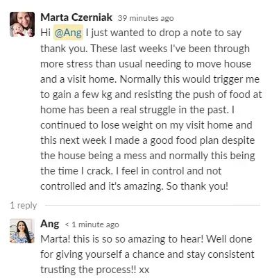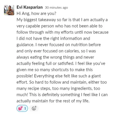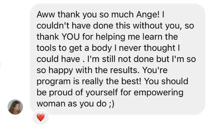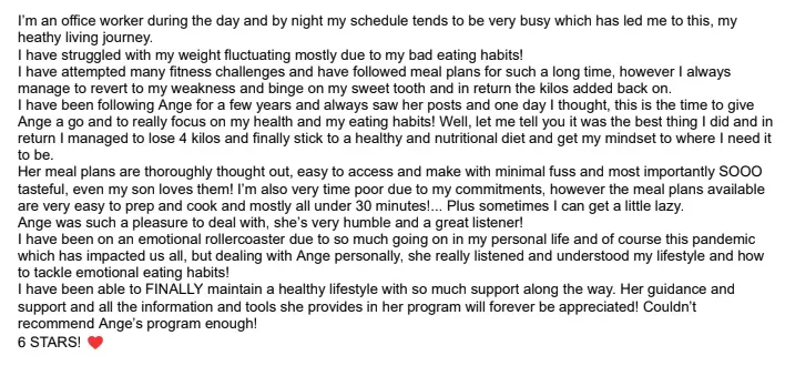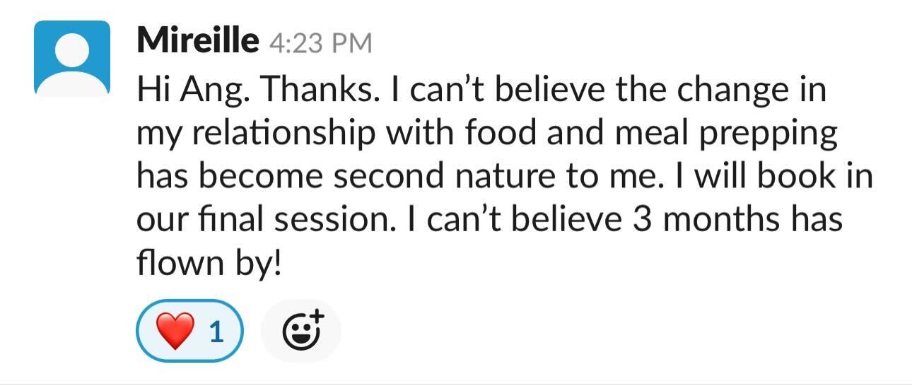 "The reason why I wanted to work with Ang is because of her "all foods fit" mentality. I just wanted something that was easy to incorporate into my daily life (...). It was a continuous stream of support with Ange. I healed my relationship with food." - Steph
