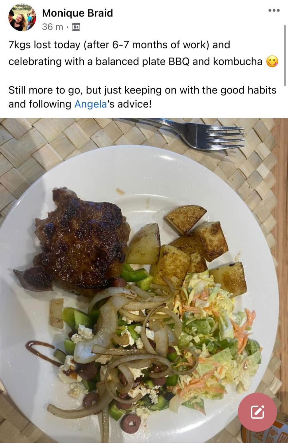 “I’ve been working with Angie for three months and I’ve lost 7kg (15lbs) during that time. Now I go to work with so much energy, energy I didn't know I had before. I've learned how to make a McDonald's meal at home with 500 less calories. My snacks are popcorn sometimes. I never thought I'd be able to put so many yummy things into my diet, so thanks Ang!” - Alison