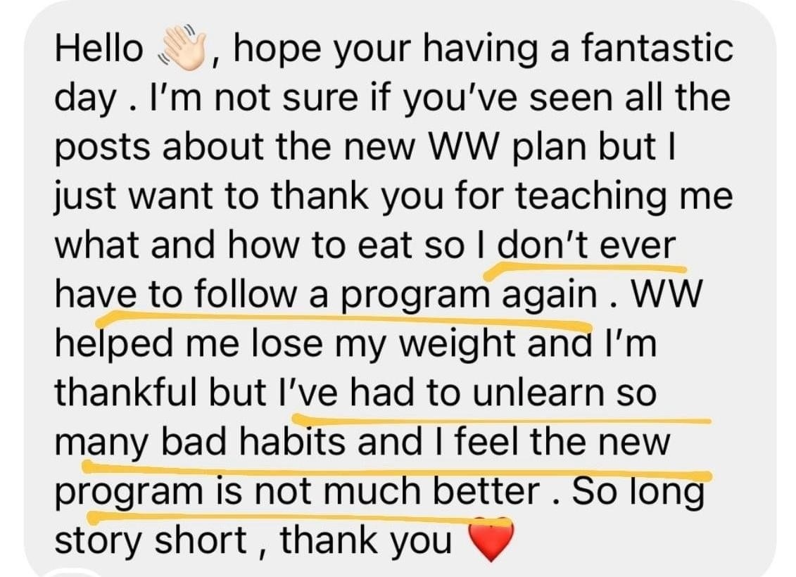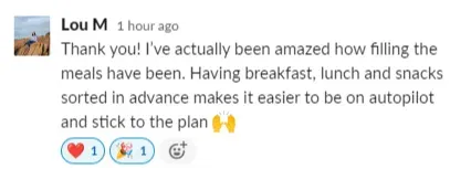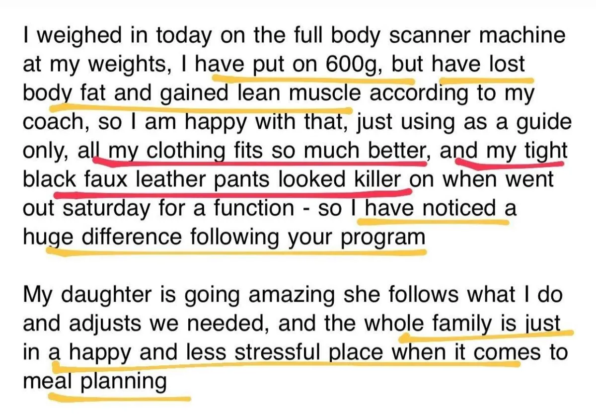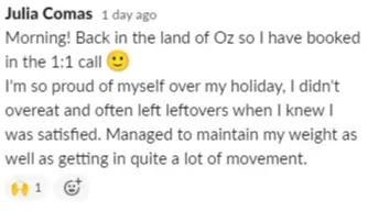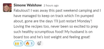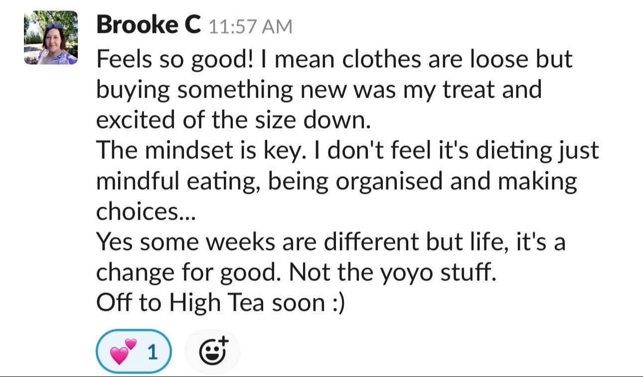 “I've completed so many diets in my time. Most of them, if not all, did not work for me. In the short term, there were some results. But long term, everything failed. I have lived this program. It has proven to be successful. I feel very accomplished. I'm almost seven kilos down[since the start of the program]. It's outstanding. I feel really good. My clothes fit better. My mindset is so much more positive, not only with my food and health but with other areas of my life as well.”