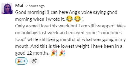 "I’ve been working with Angie for three months and I’ve lost 7kg (15lbs) during that time. Now I go to work with so much energy, energy I didn't know I had before. I've learned how to make a McDonald's meal at home with 500 less calories. My snacks are popcorn sometimes. I never thought I'd be able to put so many yummy things into my diet, so thanks Ang!” - Alison
