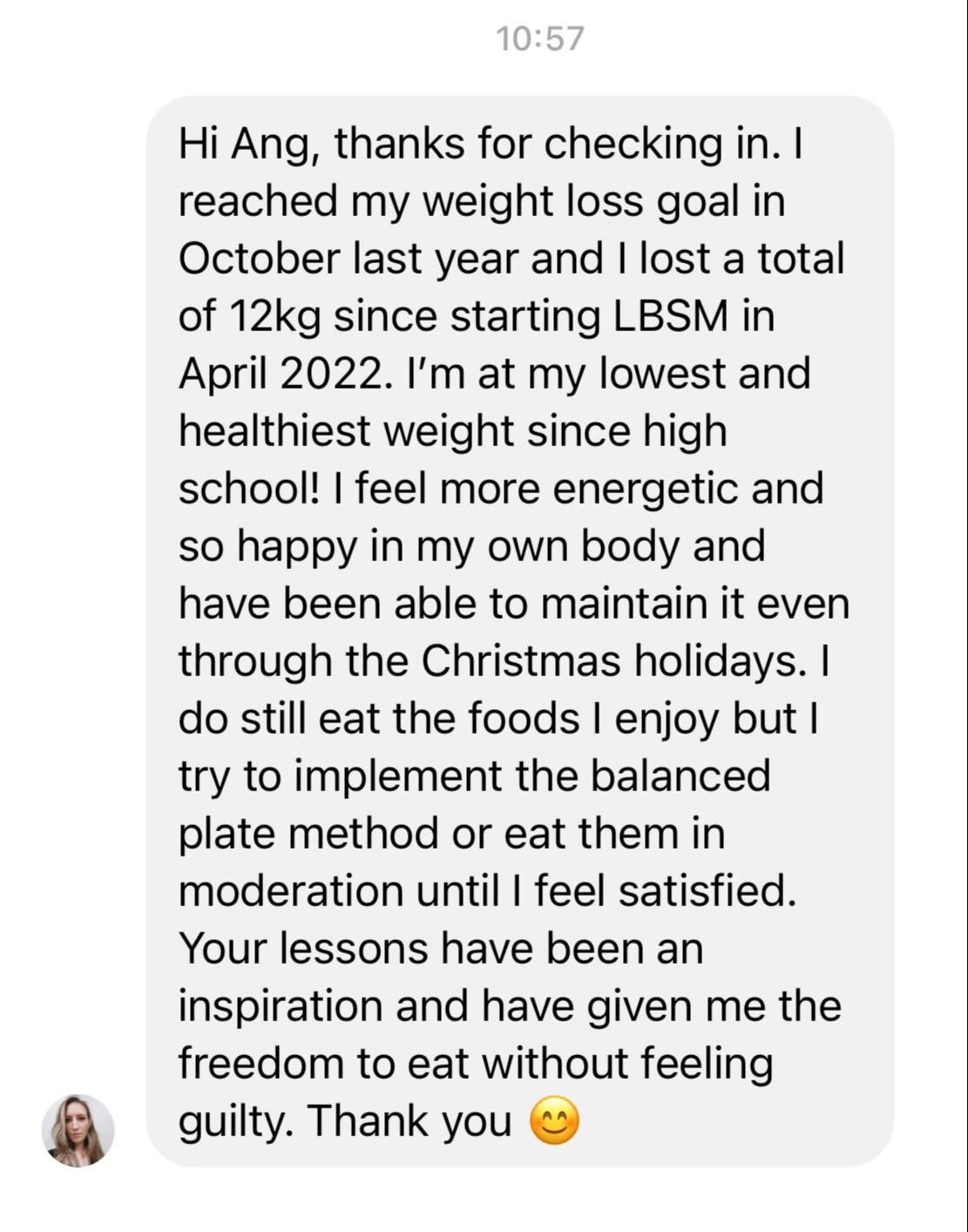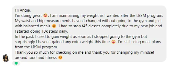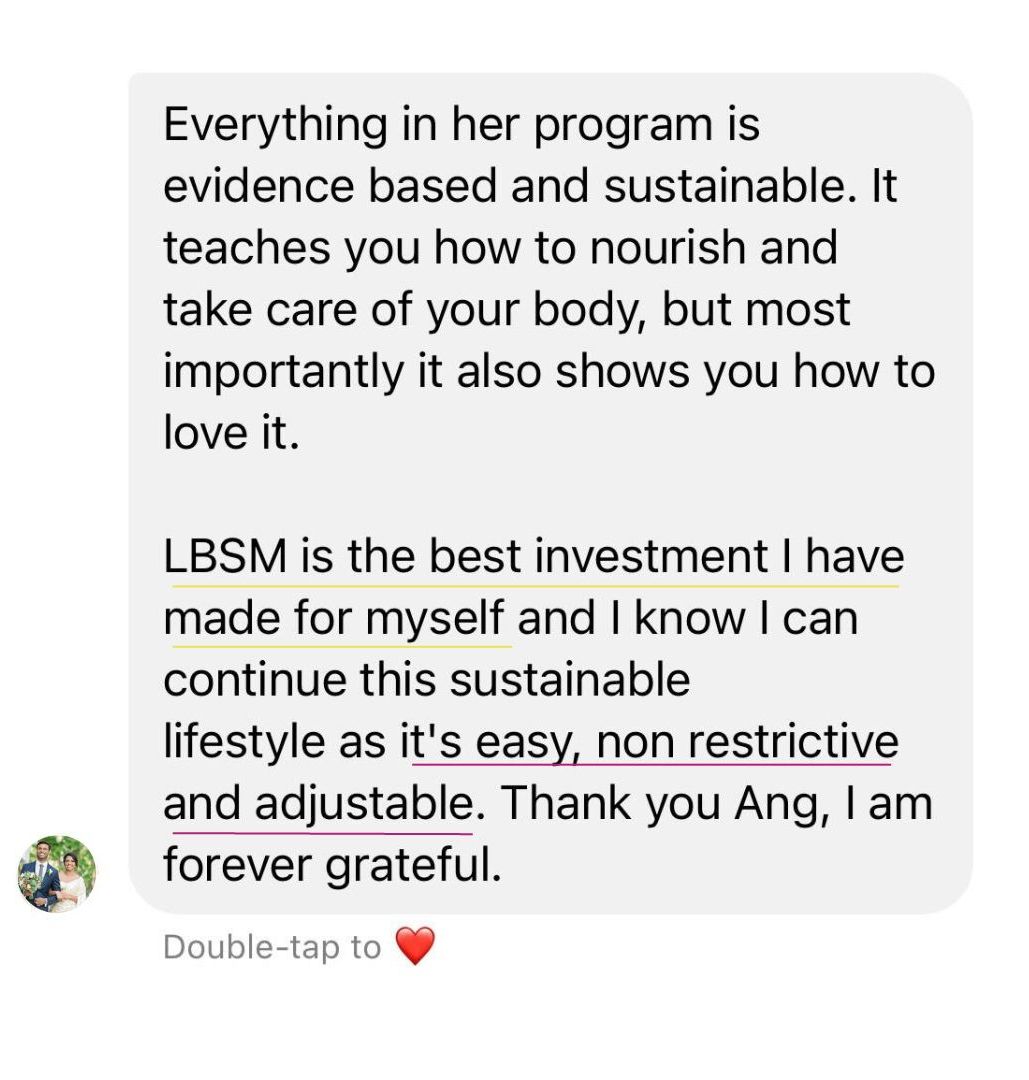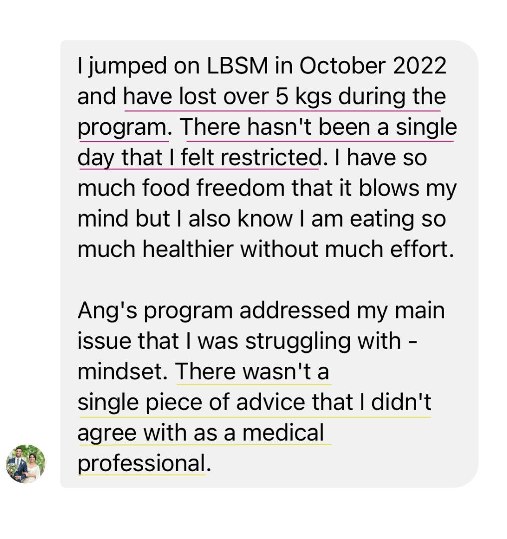 "I joined LBSM because I hated looking at myself in the mirror and getting really disappointed with myself for letting go and getting to this weight. I avoided getting my photos taken (my insta profile photo was from 2015!). I tried to get out of social events because I thought nothing I wear will look nice on me. Going clothes shopping was stressful and depressing. I've lost 11kgs (25lbs) inside LBSM and I can finally feel like I can maintain this lifestyle, unlike what I experienced with previous diets. If someone told me at the start of September where I would be in 3 months time I wouldn't believe them. I'm glad I went ahead and signed up at the time"