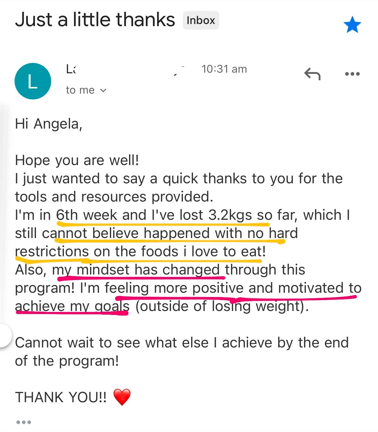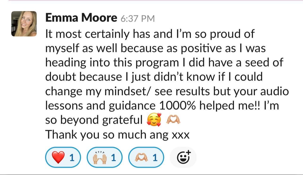 I was a bit hesitant to start Angela's program because I didn't know if it was going to work but I'm here to tell you that it's changed my life. I believe it's truly a life-changing experience" - Grace