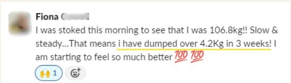 Before joining, Melinda was already eating healthy with no progress. In just 2 weeks, she was 2kgs down.